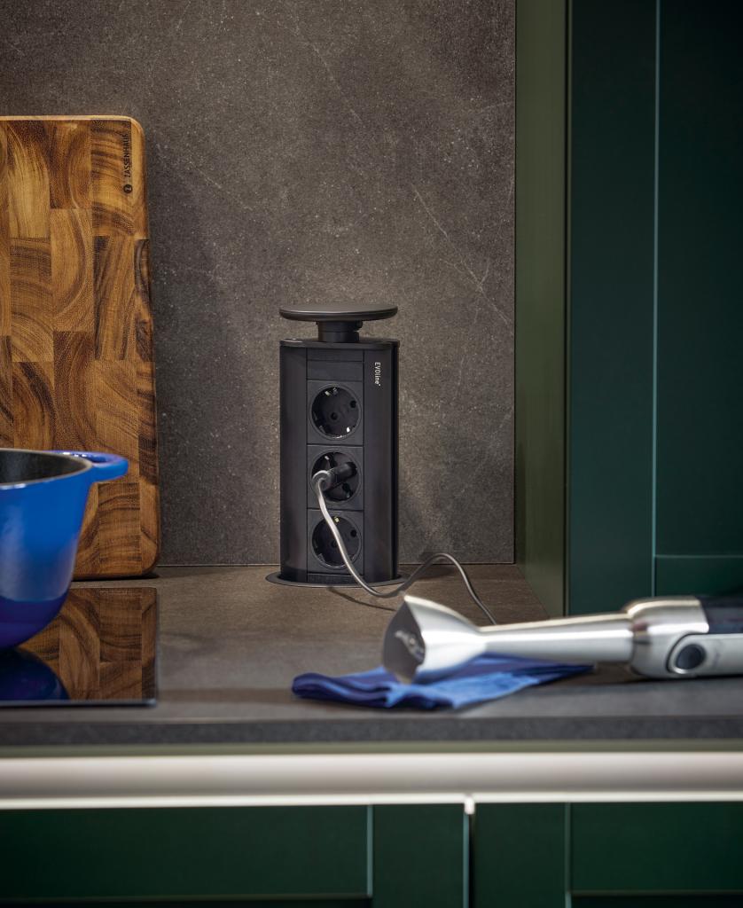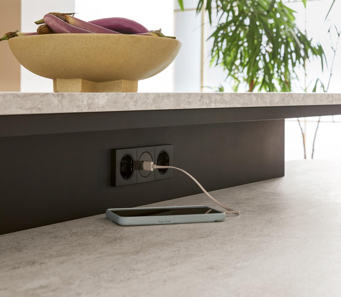 Jak to udělat: v hrubé stavbě připravte podlahový přívod v chráničce (+ klidně rezervní trubku). Na ostrůvku kombinujte boční dvojzásuvku (běžná práce) a výsuvnou/pop-up v pracovní desce (dočasné použití). U varných ostrůvků myslete na přívod pro desku i digestoř/downdraft.